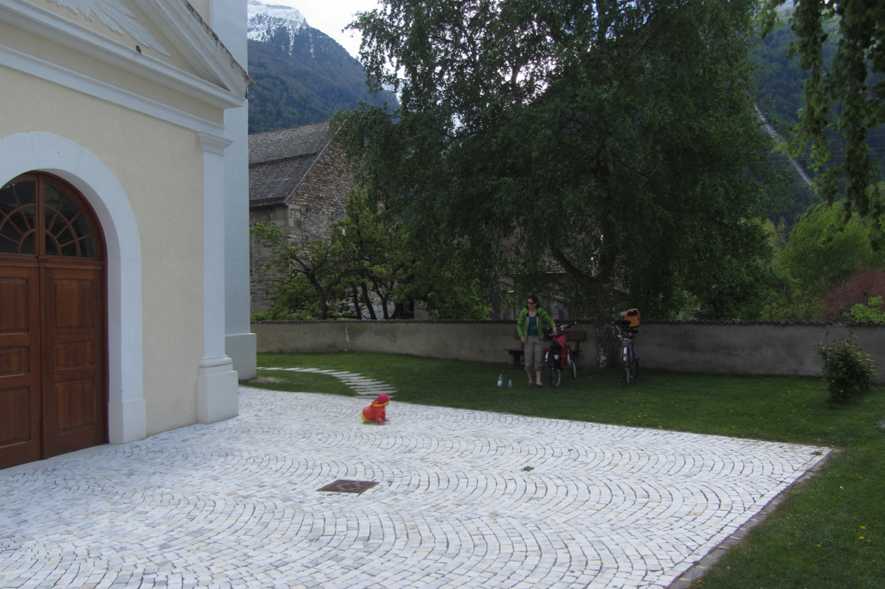 MIttagspause in der Marmorstadt Laas, hier ist natürlich auch der Kirchplatz mit Marmor gepflastert